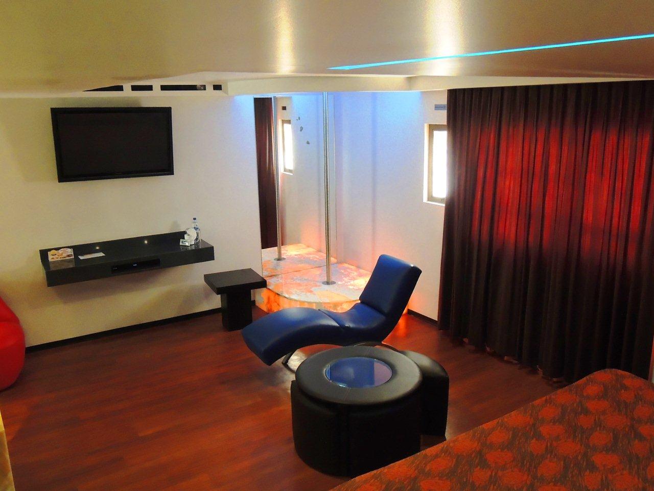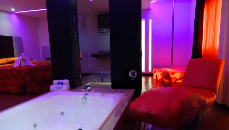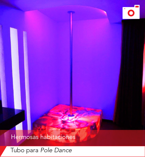 del HOTEL EJE VILLAS & SUITES, donde vas a disfrutar de amplios espacios y atracciones que no pueden faltar para enriquecer tu momento kinky, como el potro del amor y tubo para pole dance iluminado, que te cautivan al acompañarse por una pantalla gigante y el audio en sistema home theater.