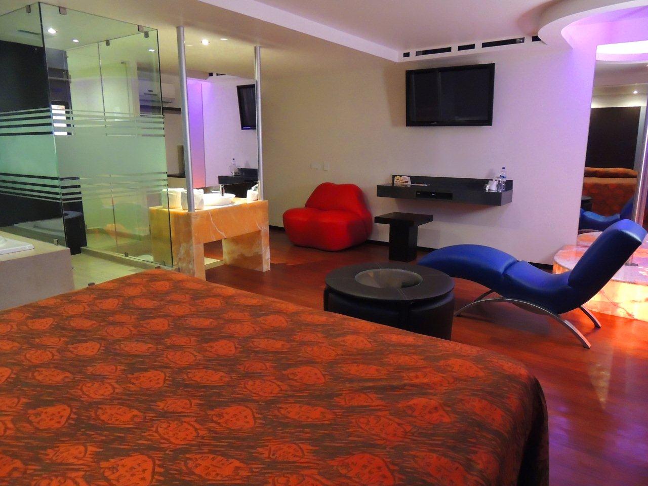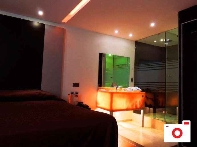 Habitación con un ambiente idóneo para despertar los instintos, amplia, con tina de cristal, jacuzzi y sonido surround.