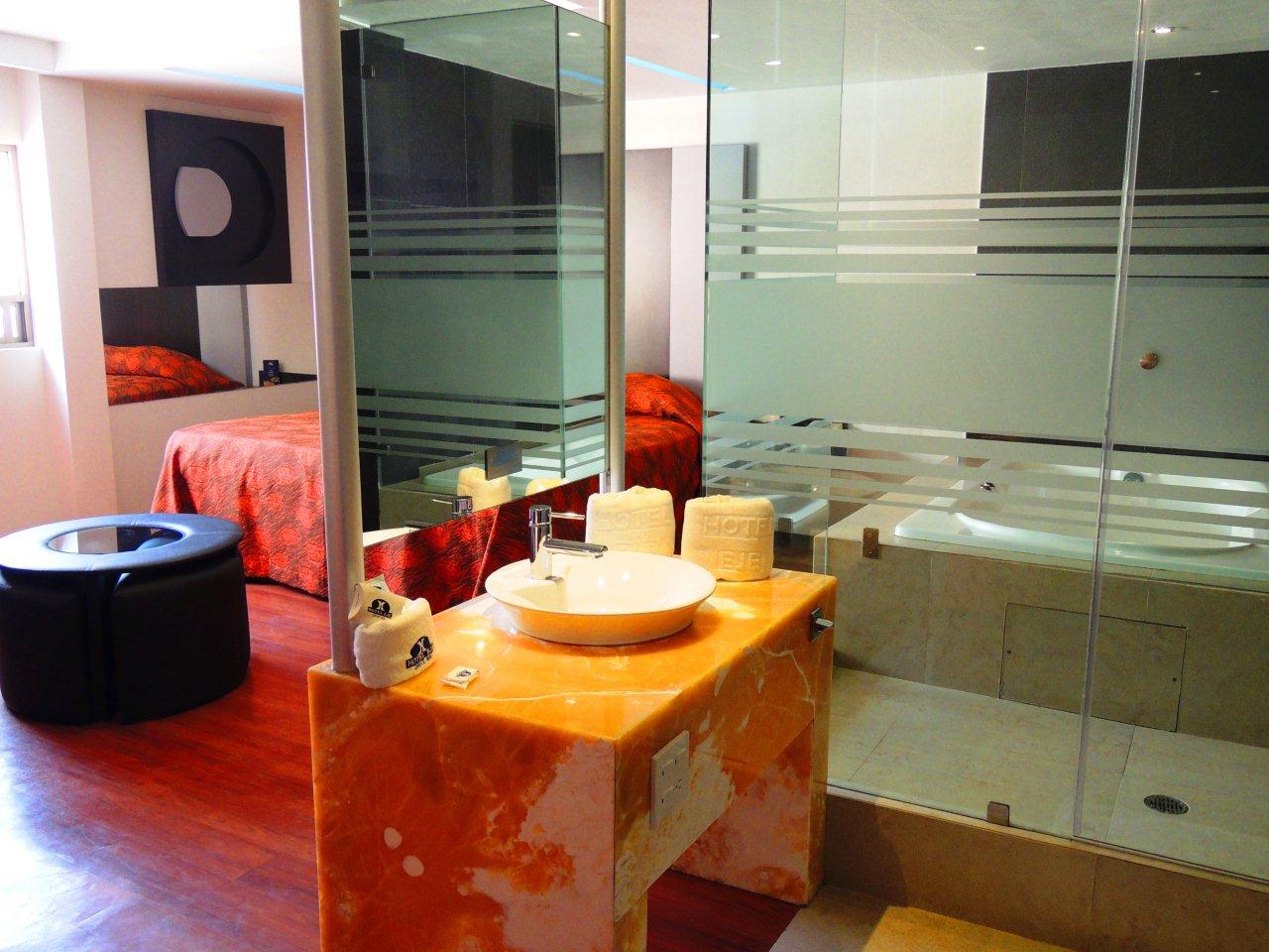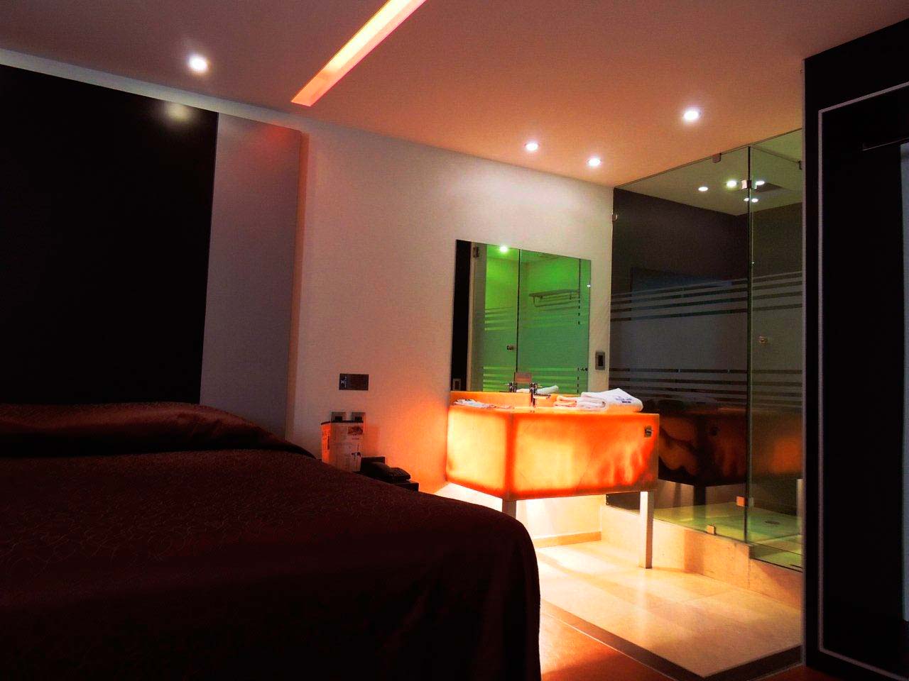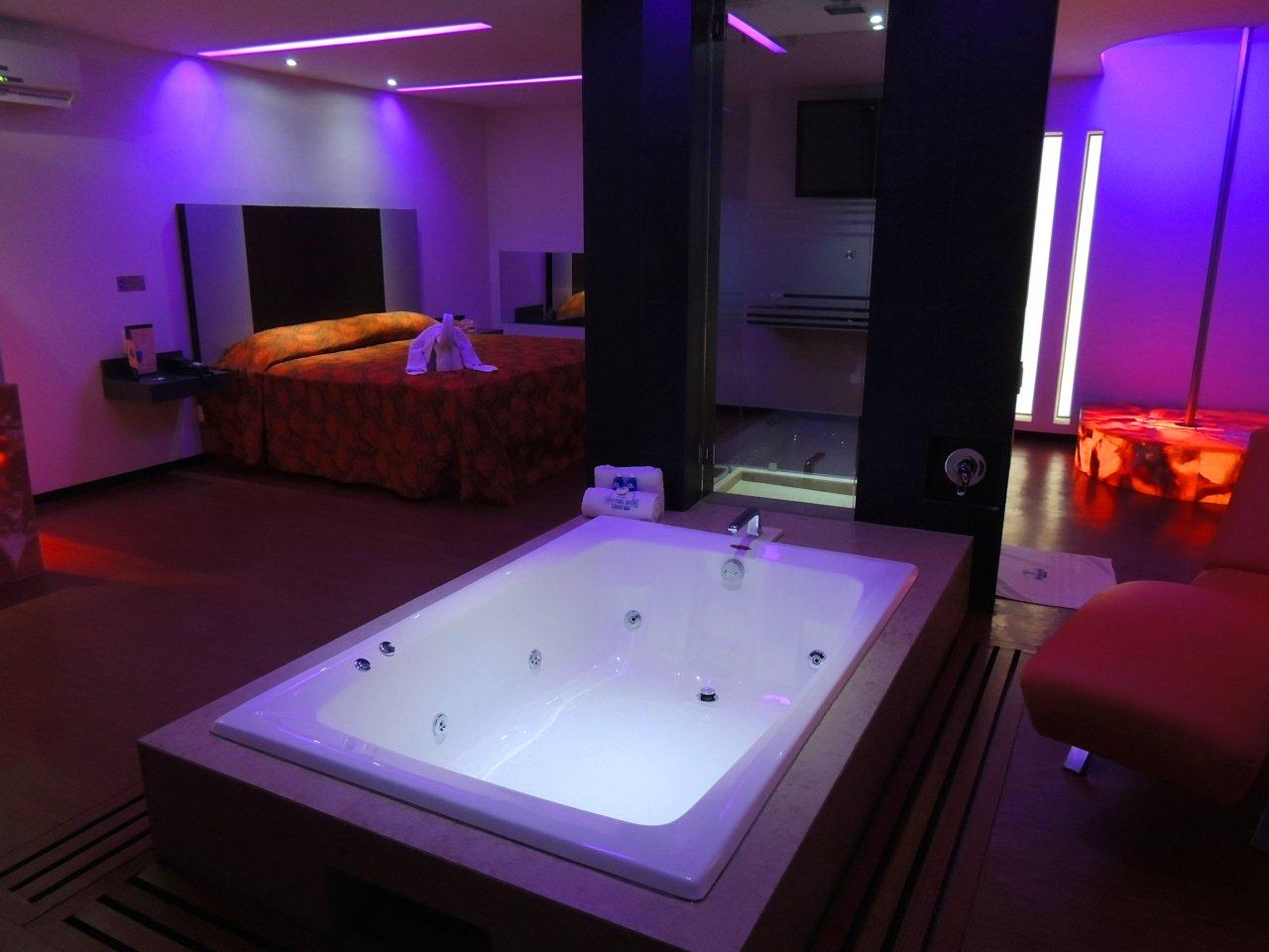 Habitación con un ambiente idóneo para despertar los instintos, amplia, con tina de cristal, jacuzzi y sonido surround.