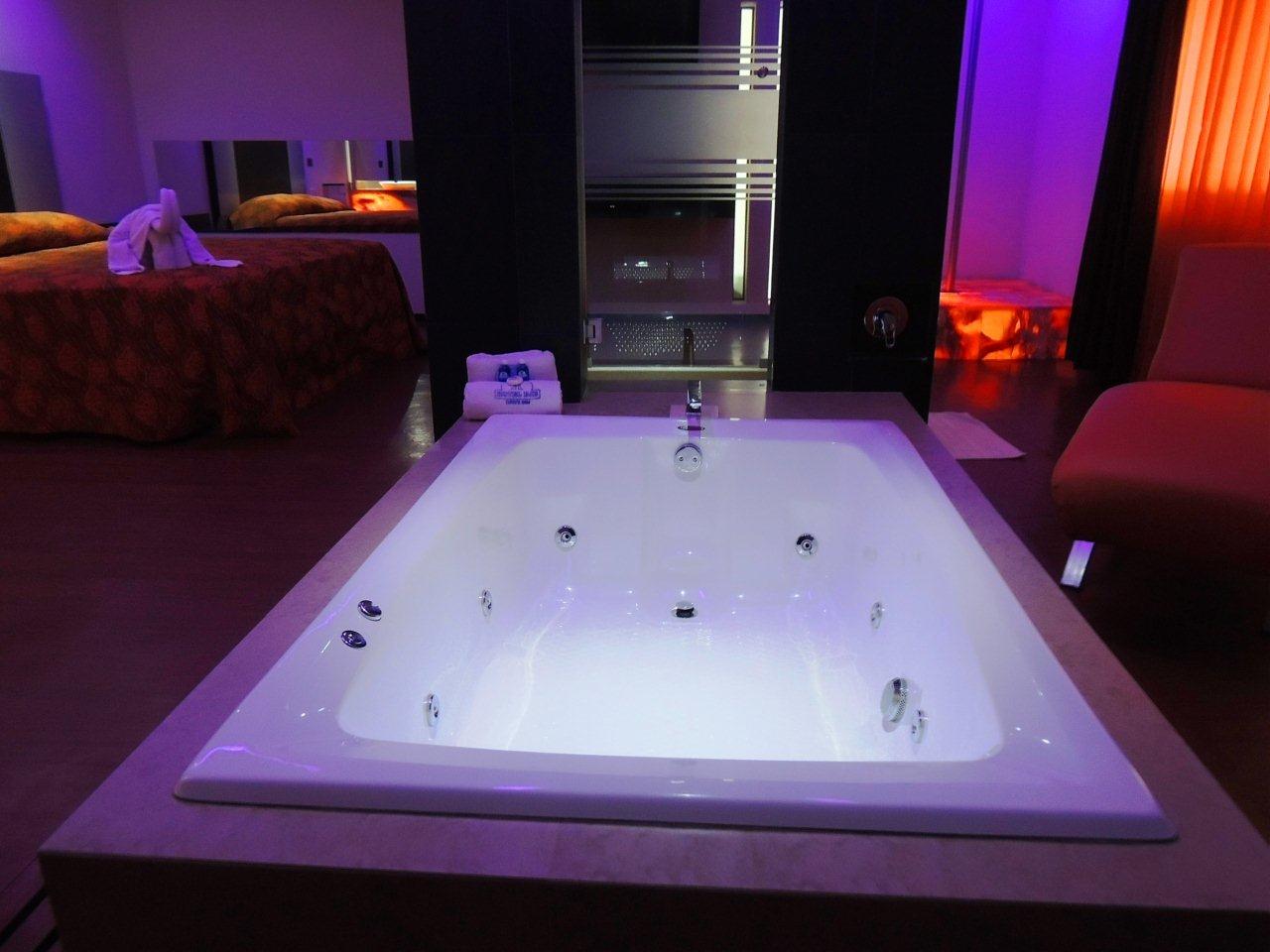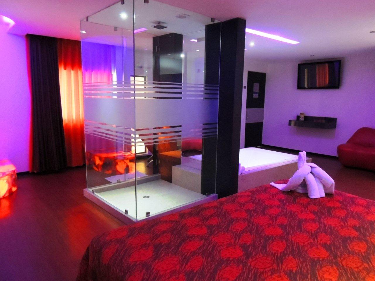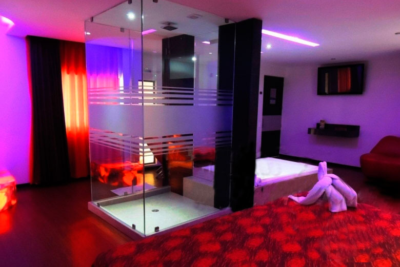Habitación con hermoso jacuzzi y ducha de cristal, para que tu encuentro resulte muy romántico y especial.